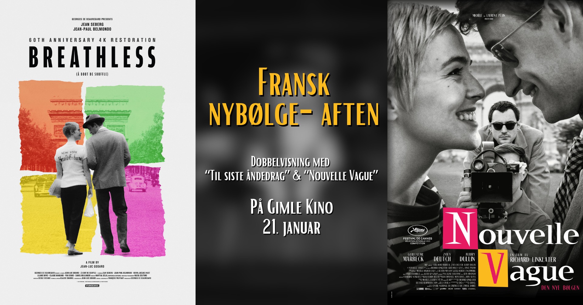 Det er med stor glede vi inviterer til fransk nybølge-aften med visning først av "Til siste åndedrag" etterfulgt av "Nouvelle Vague".