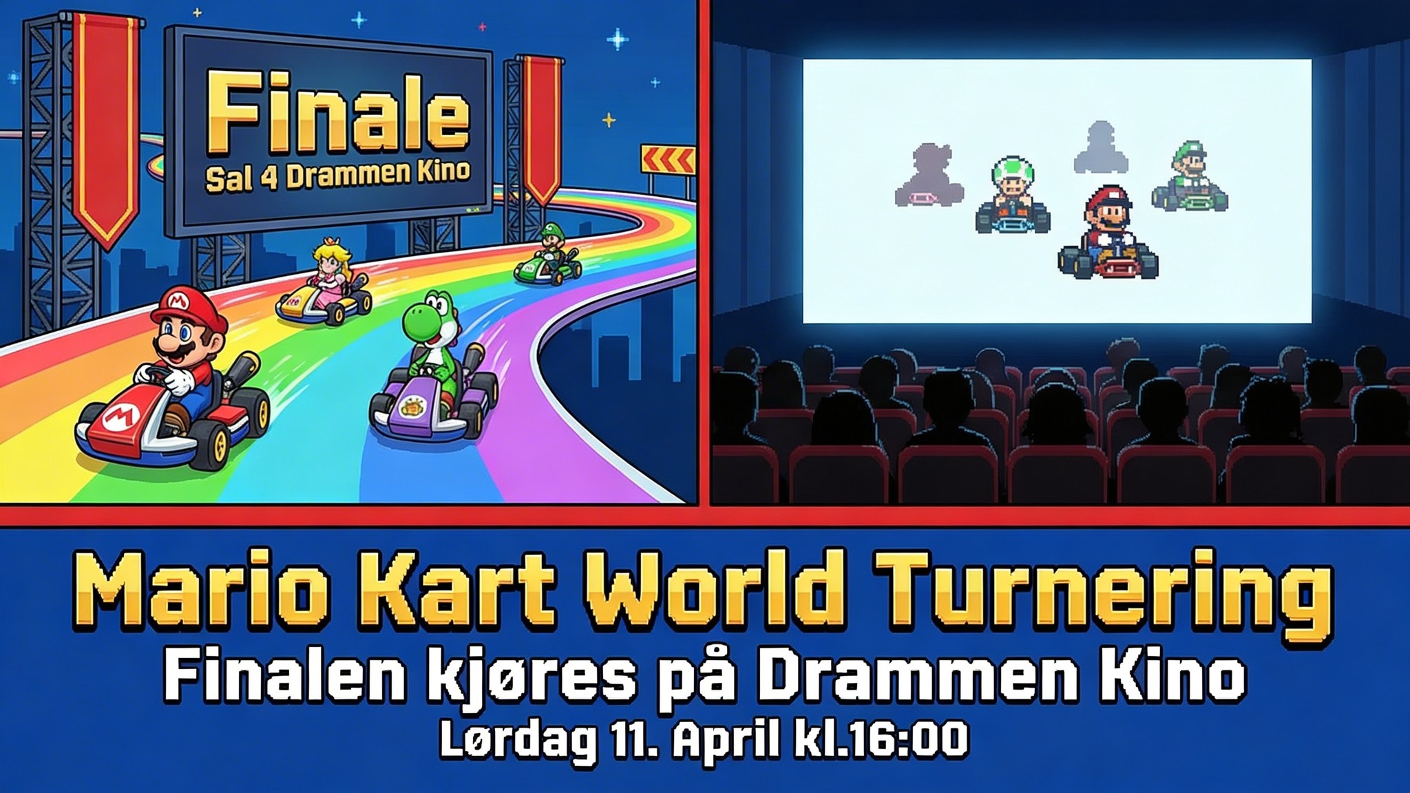 Vi inviterer til Mario Kart World-turnering i samarbeid med KanonCon, med kvalifisering i butikken og en episk finale i Sal 4 før filmen starter!